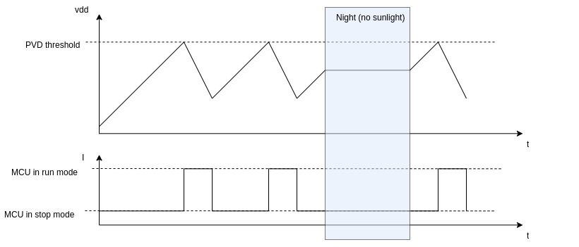 In Kombination mit der Solarzelle AM-1606C-Mell von Panasonic ist der Sensor somit komplett energieautark. Dies funktioniert sogar bei bewölktem Himmel, da die Solarzelle bei einer Beleuchtungsstärke von 200 Lux einen Strom von ca. 3,2 mA bei einer Spannung von 2,5 V liefert. Zusätzlich spielen die stromsparenden Funktionen der Bauteile, insbesondere des Mikrocontrollers und des LoRa-Moduls, eine zentrale Rolle für das Energiemanagement. Dadurch sinkt die Stromaufnahme des Gesamtsystems im Schlafmodus auf unter 5 µA (siehe Abb. 5).