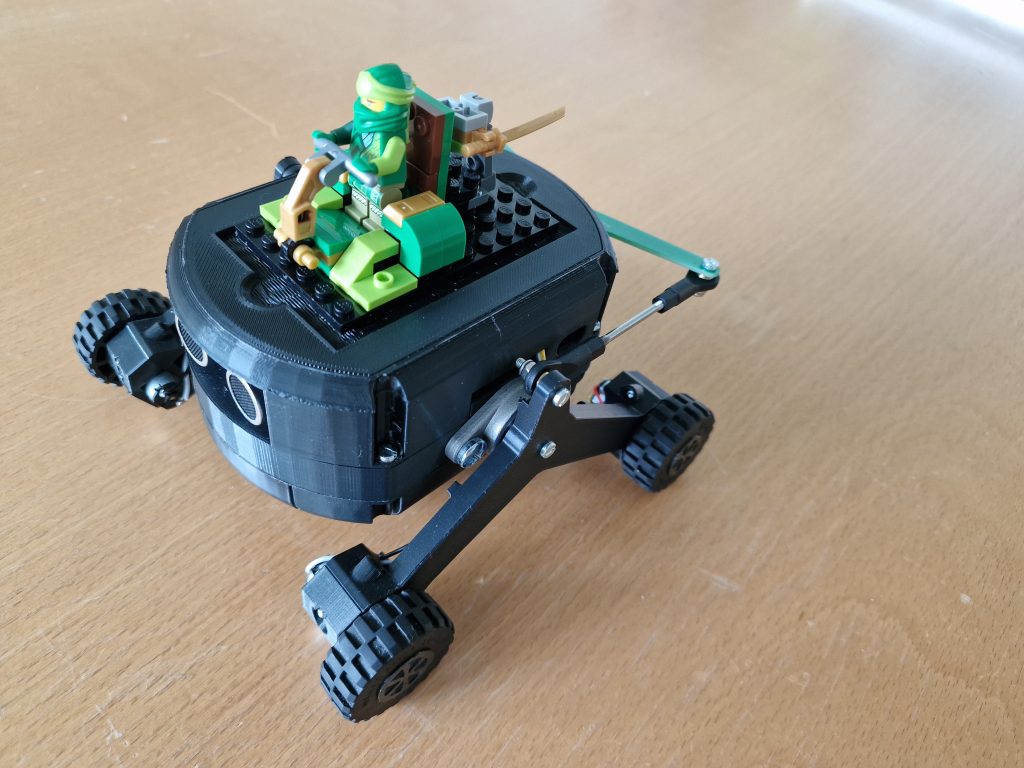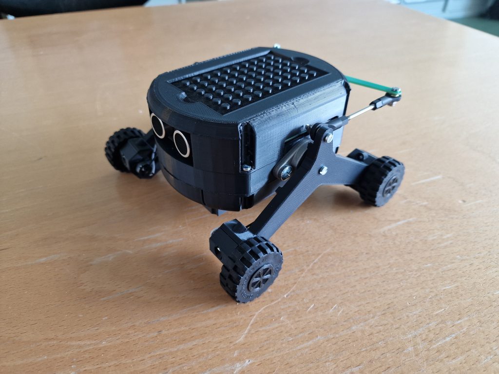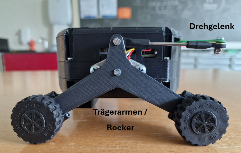 Wie bereits erwähnt, muss das Fahrzeug robust und leicht gebaut sein, damit Kinder spielerisch mit ihm umgehen können, ohne es gleich kaputtzumachen. Zugleich sollte das Material beständig und nachhaltig sein. Deshalb besteht das Gehäuse aus Polylactid (PLA), einem biologisch abbaubaren Kunststoff. PLA ist zudem kostengünstig, geruchsarm und bei Raumtemperatur formstabil. Die meisten Teile wurden im 3-D-Drucker gefertigt (siehe Abb. 5). Erwähnenswert ist, dass das Fahrwerk auf dem Rocker-bogie-Prinzip basiert. Dieses wurde ursprünglich von der NASA für Marsfahrzeuge entwickelt (siehe Abb. 6). Dieses System gewährleistet, dass sämtliche Räder permanent Bodenkontakt haben – selbst auf unebenem Terrain (siehe GIF).