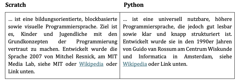 - Scratch: https://scratch.mit.edu/ oder https://de.wikipedia.org/wiki/Scratch_(Programmiersprache)