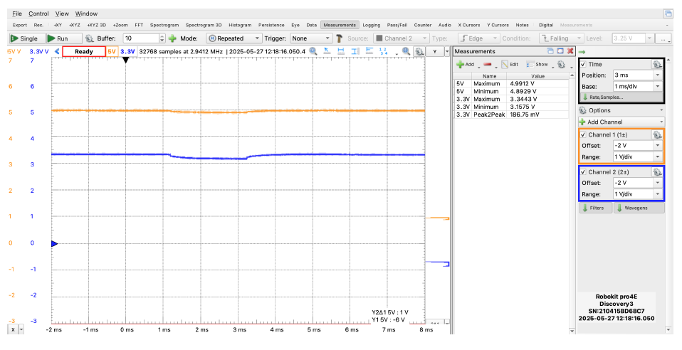 Gegen Ende des Projekts wurde bemerkt, dass die Spannungsversorgung des Logikbereichs instabil wird, wenn der Roboter viel Leistung benötigt, insbesondere durch die vier Fahrmotoren und die WLAN-Funktion (siehe Tests in Abb. 7). Im schlimmsten Fall kann dies dazu führen, dass der Mikrocontroller zurückgesetzt wird, weil die Mindestspannung nicht mehr gewährleistet ist. Eine schnelle Lösung dafür ist, die Sendeleistung des WLANs zu begrenzen und die maximale Geschwindigkeit der Fahrmotoren festzulegen.