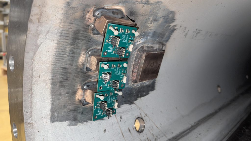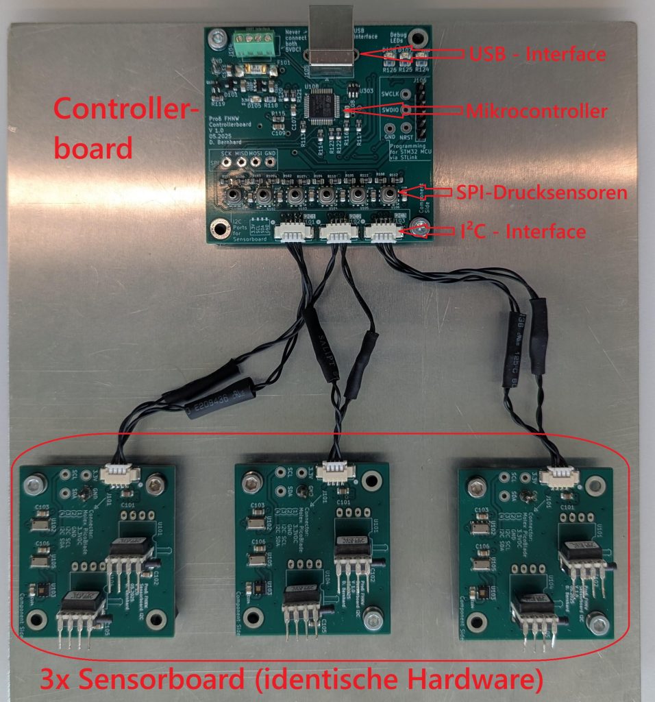 Zur Auswertung der Sensordaten ist ein Leiterplattensystem (PCB) entwickelt worden, mit dem die Sensoren ausgelesen (hardwarenahe digitale Kommunikation) und die Messwerte über ein USB-Protokoll an einen Computer geschickt werden.