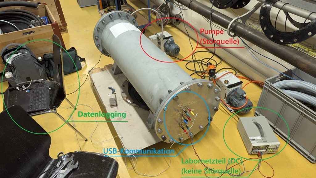 Die zu testenden Chip-Sensoren befanden sich im Inneren der Vakuumröhre. Die Kommunikation vom Computer zum Controllerboard fand über USB statt. Zu diesem Zweck wurde das USB-Kabel aufgeschnitten und durch die BNC-Buchsen ins Innere der Vakuumröhre geführt. Dem aufgeschnittenen USB-Kabel fehlte jedoch der Schirm gegen Störungseinkopplung. Da die Vakuumpumpe selbst elektromagnetische Störungen verursachen kann, wurde sie möglichst weit entfernt vom USB-Signal platziert.