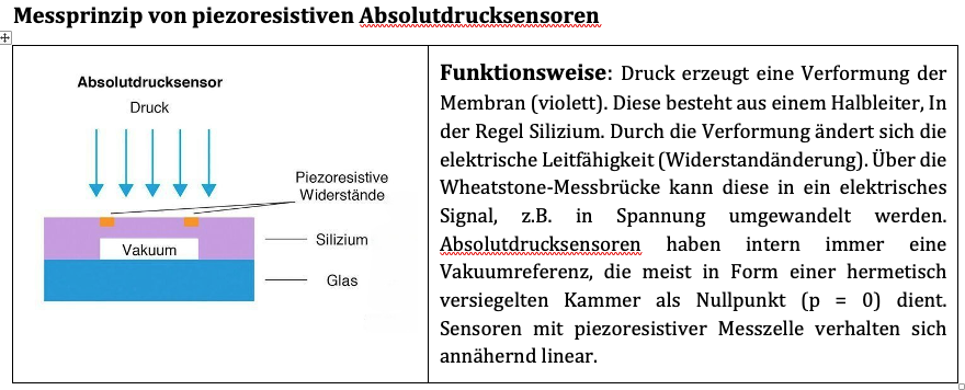 Getestet wurden drei verschiedene kostengünstige Absolutdrucksensoren, zwar jeweils sechs Stück pro Typ. Ziel war, zu prüfen, ob die Sensoren eines Typs auch konstante Resultate liefern oder ob ihre Ergebnisse signifikant abweichen. Sämtliche getesteten Sensoren, einschliesslich des Referenzsensors, messen nach dem piezoresistiven Messprinzip (siehe Infobox unten). Der Unterschied zwischen den kostengünstigen und dem Referenzsensor besteht darin, dass Letzterer intern gespeicherte Korrekturwerte enthält, die während der Herstellung ermittelt werden. Dadurch messen sie präziser.