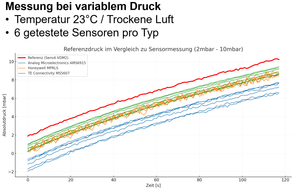 Die rote Linie entspricht dem Referenzdrucksensor. Alle anderen Farben stellen die Werte der getesteten Chip-Sensoren dar. Interessant ist deren typspezifisches Verhalten. So hat der TE Connectivity MS5607 von allen den kleinsten Offset gegenüber dem Referenzsensor. Das Zickzack-Signal des Honeywell-MPRLS-Sensors weist auf Rauschen bei diesem Sensortyp hin. Der AMS6915 weist schliesslich den grössten Offset gegenüber dem Referenzsensor auf.