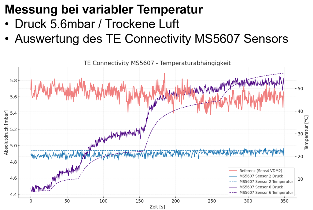 Der Referenzdrucksensor ist rot markiert, die Werte des TE-Connectivity-MS5607-Sensors, der bei Normaltemperatur (ca. 23°C) betrieben wurde, sind türkis dargestellt. Bleibt die Temperatur unverändert, so bleibt auch der gemessene Absoltdruck konstant oder schwankt nur minimal. Die violetten Werte stammen vom TE-Connectivity-MS5607-Sensors, dessen Temperatur verändert wurde. Die gepunktete Linie zeigt die Temperatur, die durchgezogene violette Linie den gemessenen Absolutdruck. Es ist klar zu erkennen, dass sich der gemessene Druck mit steigender Temperatur verändert. Der TE Connectivity MS5607 ist also ganz klar temperaturabhängig.