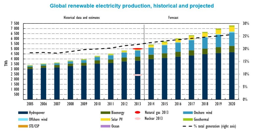 Heute hat die internationale Energieagentur IEA (http://www.iea.org/) ihre jährliche Energiemarktanalyse «Medium Term Renewable Energy Market Report 2014» vorgestellt. Diese Untersuchung zeigt, dass die erneuerbaren Energien im Strommarkt heute weltweit bereits 22% ausmachen. Bis 2020 wird ihr Anteil voraussichtlich bis gegen 30% anwachsen.