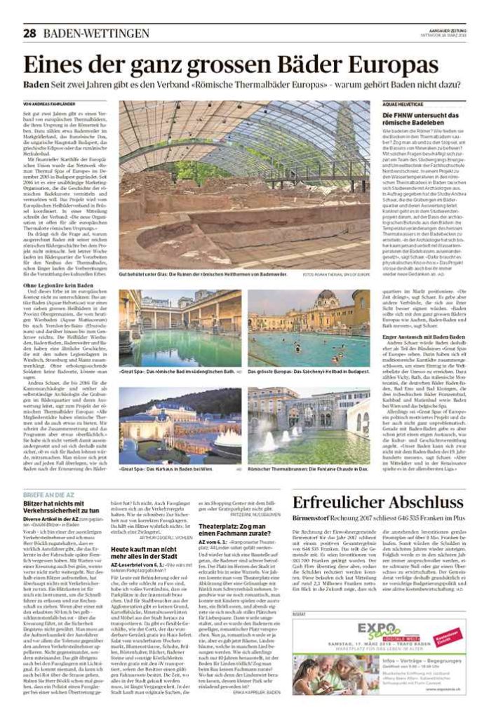 Die heutige Ausgabe der Aargauer Zeitung berichtet in den Regionalteilen von einem EUT-Projekt. Unter dem Titel “Die FHNW untersucht das römische Badeleben” fasst der Journalist das Projekt “KurT” zusammen, das mittels thermodynamischer Modelle die Temperatur der römischen Bäder in Baden ermittelt.