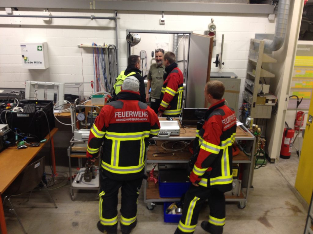 Das Team arbeitete hart, doch erst am Freitag gelang es den Heizkörper so aufzuheizen, dass die Messinstrumente etwas anzeigten. Die Freude war gross! Aber auch der Feuermelder im Testraum roch etwas, sodass die Feuerwehr kam und sich für den Aufbau interessierte. Das Laborgebäude wurde umgehend geräumt. Dabei war alles harmlos. Ob der Heissluftföhn oder der der Raumheizer selbst die Feuerwehr geholt hat, werden die Auswertungen zeigen.