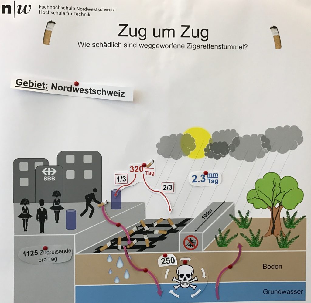 Wie schädlich sind eigentlich diese weggeworfenen Zigarettenstummel? So die nächste Arbeitsfrage. Das Team unter Leitung von Beat Reichlin untersuchte im Hauptteil ihres Projekts auch die Schadstoffe in einem Zigarettenstummel. Nikotin, Aluminium, Cadmium, Blei und Arsen befinden sich in den Zigarettenresten. Je nach Bau des Bahnhofs würden diese Schadstoffe durch den Regen aus den Stummeln gewaschen. Allerdings überschritten diese Schadstoffe keine Grenzwerte, kommt das Team zum Schluss.