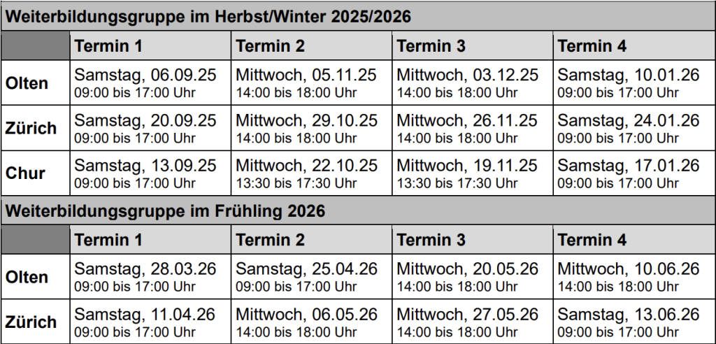 Unsere Weiterbildungskurse im Schuljahr 2025/26 ist bereits ausgebucht. Nachfolgend finde Sie die Durchführungszeiten pro Standort und Gruppe. Der genau Raum der Weiterbildung wird noch per E-Mail kommuniziert.