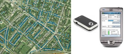Bilder: Ausschnitt aus dem Bearbeitungsperimeter mit den erfassten geokodierten Adressen für das Projekt OpenAddresses und Bluetooth-GPS-Empfänger und PDA mit GeoDataSnapper-Software