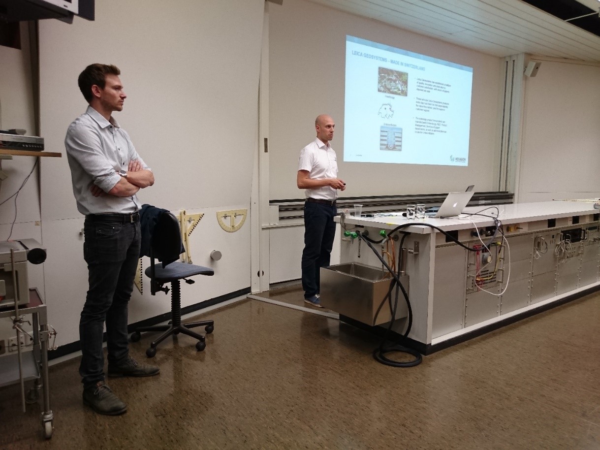 Am 22.5.2018 hatte das Institut Geomatik Gelegenheit, im Rahmen des Frühlingskolloquiums Einblicke in einen spannenden Teilbereich des «Digital Manufacturing» zu erhalten. Herr Dr. Francesco Crivelli, Maschineningenieur am Centre Suisse d’Electronique et de Microtechnique (csem), und Herr Valentin Baumann, Produktspezialist für Scanning und Integrated Solutions bei Leica Geosystems, berichteten über den Einsatz moderner Vermessungstechnologien für die Echtzeit Positionserfassung von Objekten in der industriellen Fertigung.