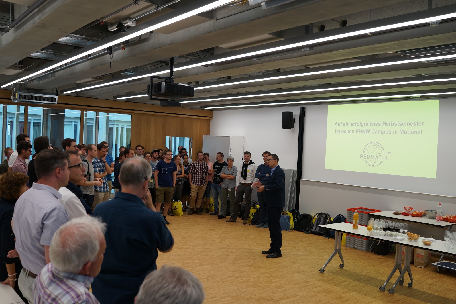 Der Semesterstart der Neueintretenden im Studiengang BSc Geomatik findet gemeinsam mit den anderen Studienrichtungen an der Hochschule für Architektur, Bau und Geomatik statt. Nach einer Begrüssung durch den Direktor der Hochschule Ruedi Hofer, wird der neue Campus Muttenz in einigen Fachreferaten erklärt und anschliessend in einer Gebäudebegehung live vorgestellt.