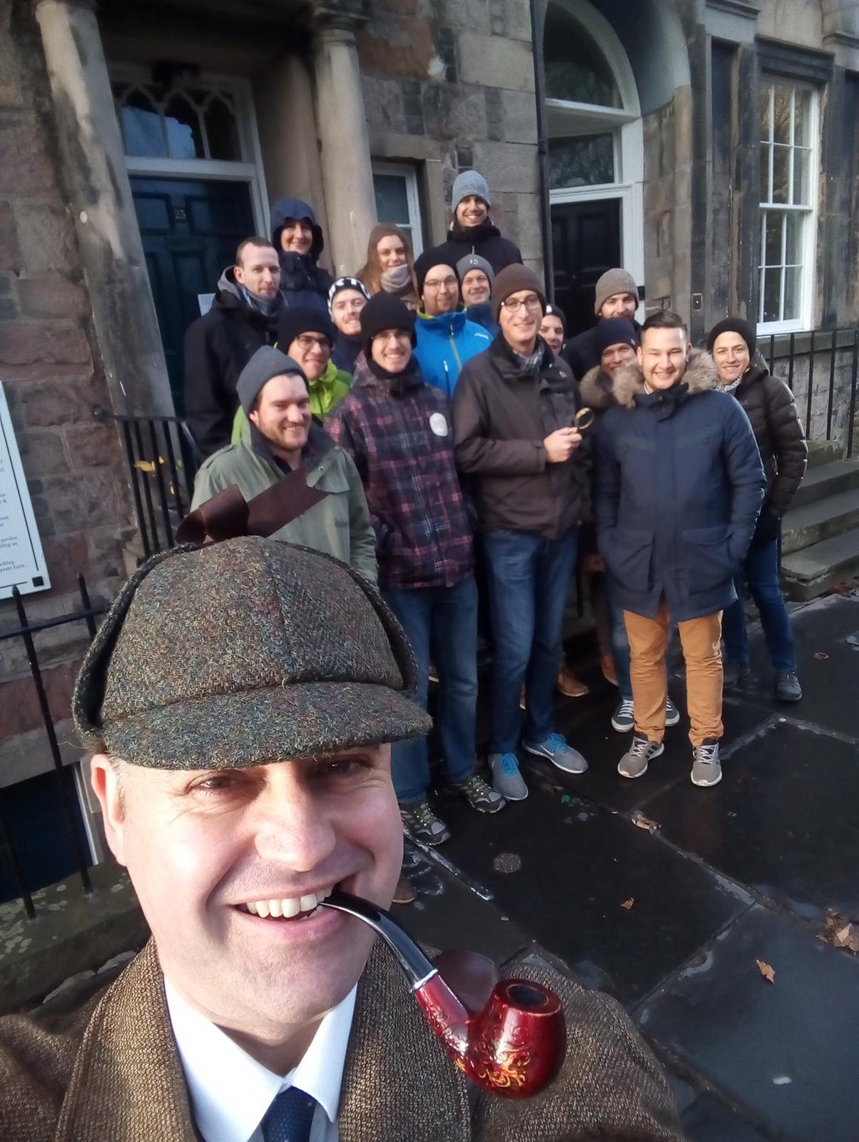 On Monday morning, we did the Sherlock Holmes walking tour. This walking tour was not an ordinary guided tour. We saw many places where Sir Arthur Conan Doyle, the author of the Sherlock Holmes books, lived and studied. This walking tour was really interesting. The tour guide was costumed as Sherlock Holmes and was very enthusiastic about Sir A. C. Doyle, so it was very exciting for us to follow him and find out how the author came up with the story of Sherlock Holmes.