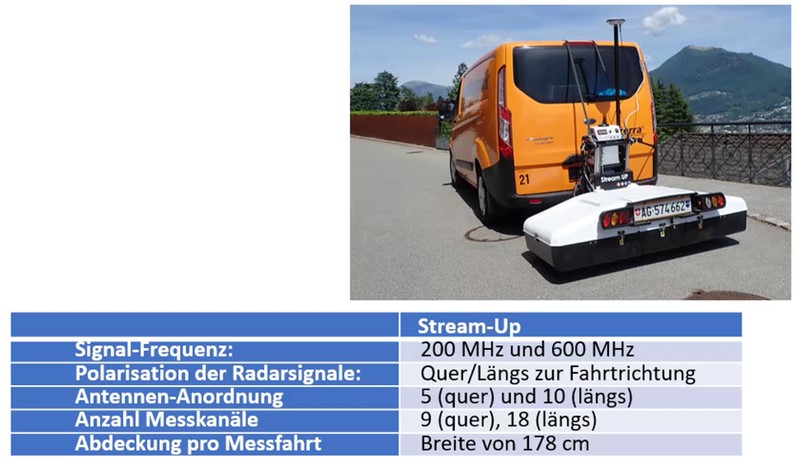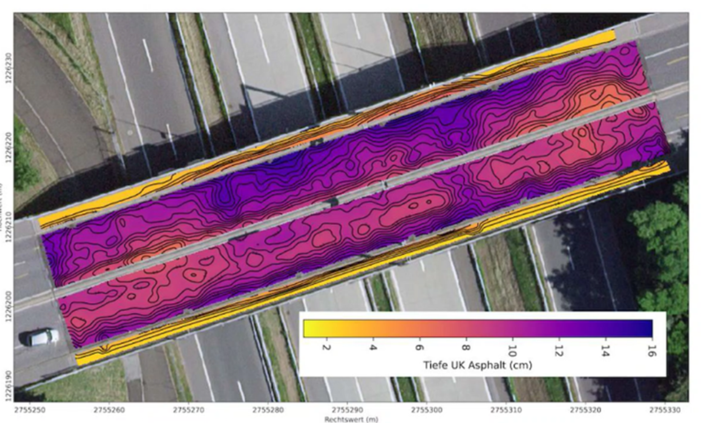 Mit dieser Messmethode kann z. B. die Belagsmächtigkeit geprüft werden, um herauszufinden, ob die Fahrbahn den Spezifikationen entspricht und der geplanten Belastung standhalten wird. Dabei wurden die Messungen mithilfe von zehn Bohrkernen kalibriert. Bei der Datenerfassung war wichtig, dass die Aufnahmegeschwindigkeit konstant blieb. Dabei wurden im Belag stark variierende Mächtigkeiten des Belags festgestellt.