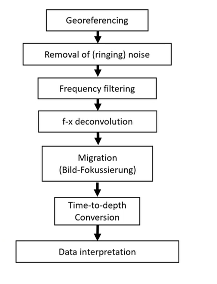 Es gibt diverse Parameter, die das Messergebnis beeinflussen. Wenn ein Boden mit Regenwasser gesättigt ist, kann das Bild vom selben Boden nach einer zweimonatigen Trockenperiode andere Resultate liefern. Bei manchen Projekten werden punktuell Bodenproben entnommen, um die Messresultate zu verifizieren und zu kalibrieren. Die Prozessierung dieser Messdaten ist aufwendig und die Interpretation bedarf viel Erfahrung. Manche Objekte, wie z. B. eine einfache Leitung kann teilweise durch die Analyse der Lifedaten im Feld erfolgen, dann kann man sich die Nachprozessierung sparen. Für ein Projekt mit Büroauswertung könnte der Prozess aber folgendermassen aussehen.