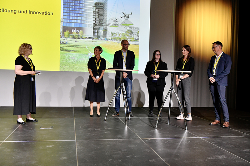 Im Anschluss an die Festrede diskutierten die prominenten Vertreterinnen und Vertreter aus der Geomatikbranche, Romy Maunz (Hexagon / Leica Geosystems), Yves Maurer (Bundesamt für Raumentwicklung ARE), Livia Rubi (Studentin Bachelor Geomatik), Lisa Stähli (Esri) und Dr. Hannes Eugster (iNovitas) in dem von Monika Spring moderierten Podium, darüber «wohin die Reise geht?», konkreter was die aktuellen Herausforderungen der Geomatik seien, wo wir in 10 und wo wir in 30 Jahren stehen könnten.