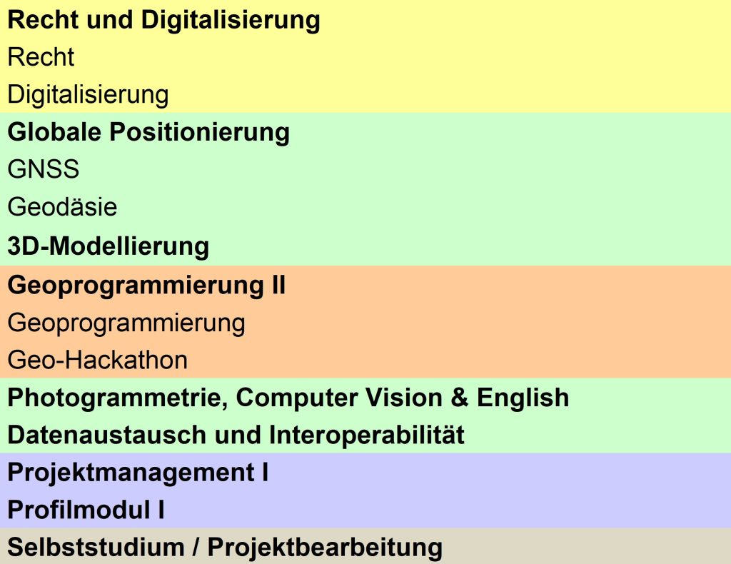 Nebst dem Vertiefungsprofil vertiefst du dich in weiteren Bereichen der Geomatik und nimmst an einem 2-tägigen Hackathon teil. Zwischenprüfungen gibt es nur noch vereinzelt, dafür werden mehr benotete Abgaben verlangt. Das Vertiefungsprofil wird mit einer mündlichen Prüfung abgeschlossen. Nach den Modulabschlussprüfungen hast du wieder frei bis zum Feldkurs. In dieser Zeit kannst du z.B. in einem anderen Betrieb arbeiten, damit du in einem Jahr besser weisst, wo du dich bewerben sollst, oder ob du gleich noch den Master anhängen möchtest.