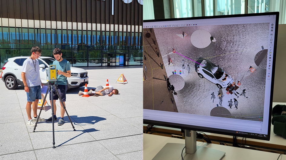 Beim Laserscanning-Workshop nutzten die Teilnehmenden drei verschiedene Laserscanner (Trimble X7, NavVis VLX3 und Leica RTC360) in drei unterschiedlichen Szenarien. Eines davon war die Erfassung und anschliessende Auswertung eines simulierten Autounfalls. Ziel war es, anhand der Bremsspur die Geschwindigkeit des Fahrzeugs zu berechnen und Veränderungen in der Punktwolke zu identifizieren.