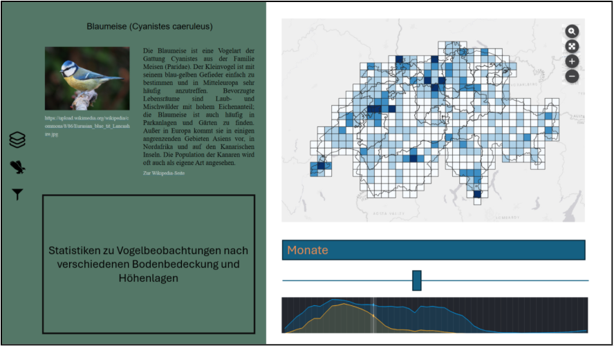 In meiner Gruppe entwickelten wir eine Web-App, die es Vogelliebhabern ermöglicht, sich über Vogelarten und Sichtungsgebiete zu informieren, mit dem Ziel, wertvolle Informationen bereitzustellen, ohne durch präzise Standortdaten seltene Arten zu gefährden. Ausgangspunkt war das Interesse eines Teammitglieds, das begeisterter Vogelbeobachter und Fotograf ist und den Wunsch nach einer Plattform äusserte, die die Sichtungen der Vögel darstellt.