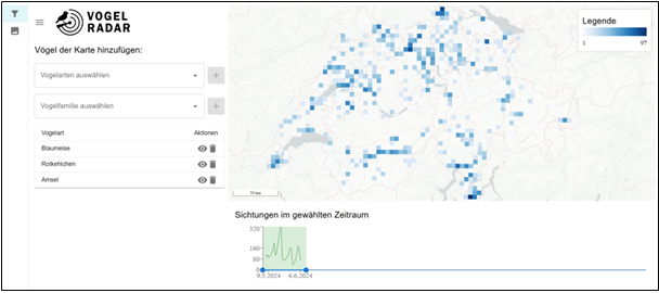 - Interaktive Karte, die häufigen Sichtungen von Vögeln in einem Raster darstellt.