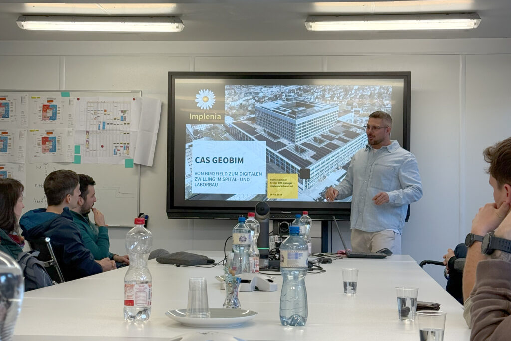 Den Abschluss und zugleich Höhepunkt der Intensivwoche bildete eine gemeinsame Exkursion zum Neubau des Kantonsspitals Aarau. Dort erhielten die Teilnehmenden Einblicke in das BIM-Bauprojekt sowohl aus Sicht der Geomatik (Patrick Keusch, Planora AG) als auch aus Sicht des Totalunternehmers (Patric Sommer, Implenia). Nach einem gemeinsamen Mittagessen bestand zudem die Möglichkeit, das nahezu fertiggestellte Kantonsspital vor Ort zu besichtigen.