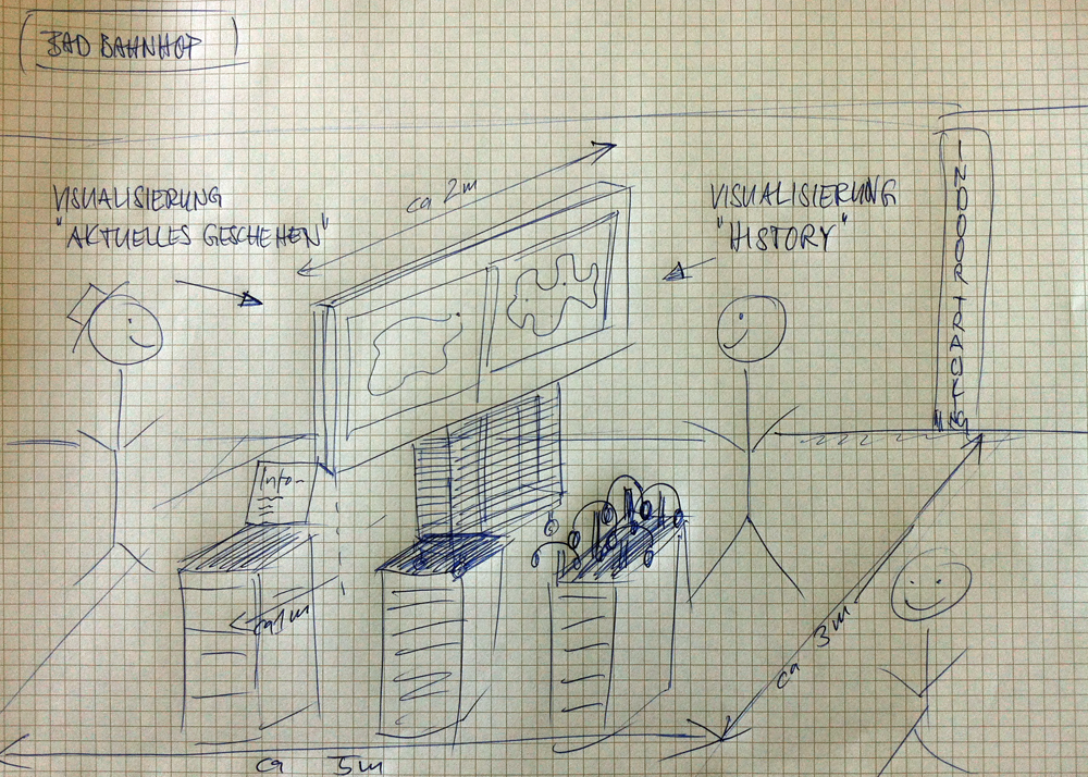 Soviel steht bereits fest: Im Rahmen unseres Projekts werden Zuhörer auf eine Gebäudereise durch den Badischen Bahnhof geschickt. Start- und Zielpunkt ist ein Informationsstand, hierzu eine erste Skizze: