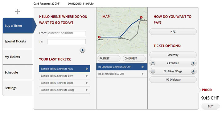 The project task 2012 goes into the future of ticketing: How will we buy a ticket for the train in the future? How can we improve existing interface and interaction solutions? The project ON TRACK is about the development of new concepts for ticket vending systems in cooperation with A-Welle, a Swiss public transprotation consortium.