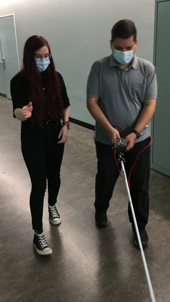 Im Studienjahr 2020/2021 erarbeitete Jenny Meier, eine Studentin am Studiengang EIT der FHNW im Auftrag des Schweizerischen Blindenverbands einen ersten Prototypen eines intelligenten Blindenstocks, welcher die Betroffenen bei der Erkennung von Hindernissen wesentlich besser unterstützen soll als der bekannte weisse Stock. Der entstandene Prototyp stiess bei den Auftraggebern auf grosse Begeisterung. Anschliessend übernahm mit Ryo Widmer ein zweiter Student des Studiengangs EIT die Vorarbeiten. Er ist derzeit daran, den Prototyp auszureifen.