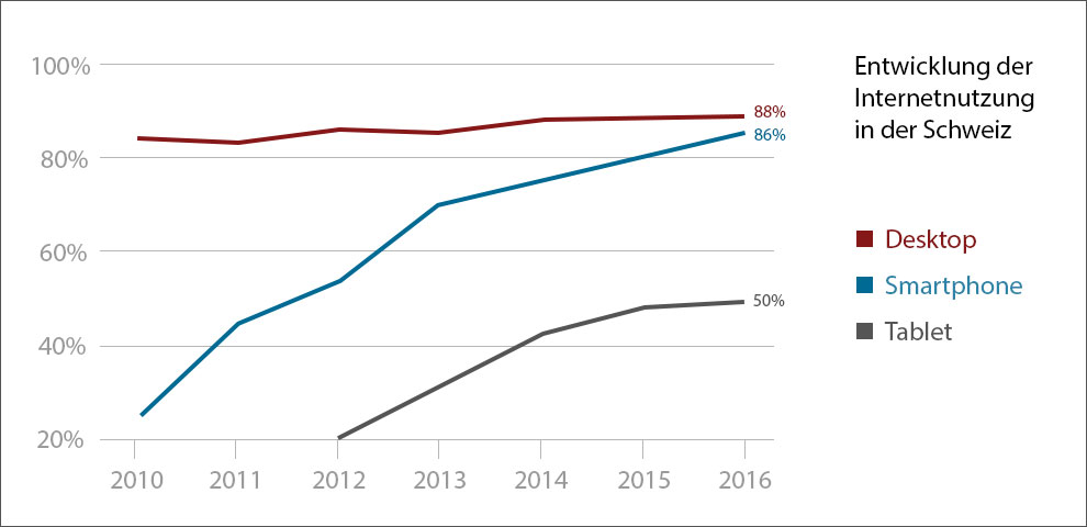 In Märkten, wie den USA oder Japan erreichen Google bereits heute mehr Suchanfragen über mobile Geräte als von Desktops aus. Google prognostiziert zudem, dass 2018 weltweit die mobilen Nutzerzahlen diejenigen der stationären überholt haben wird. Auch für die Schweiz zeichnet sich ein entsprechender Trend ab:Quelle: Media Use Index Studie 2016 (MUI), Y&R Group Switzerland