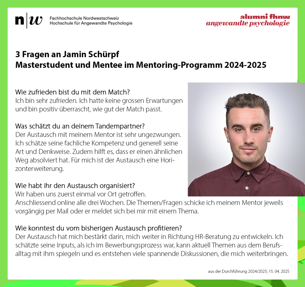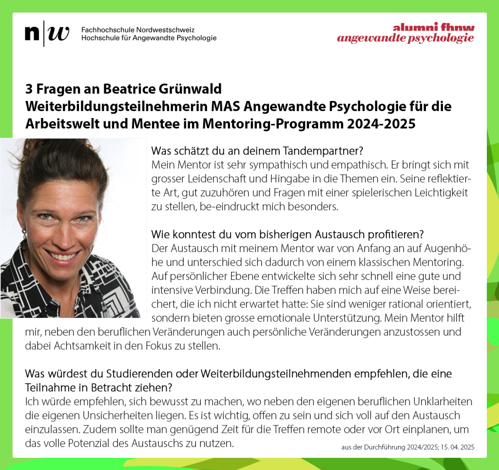 Das Mentoring-Programm ist eine Kooperation der Hochschule für Angewandte Psychologie FHNW und des Vereins Alumni FHNW Angewandte Psychologie.
