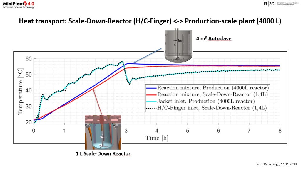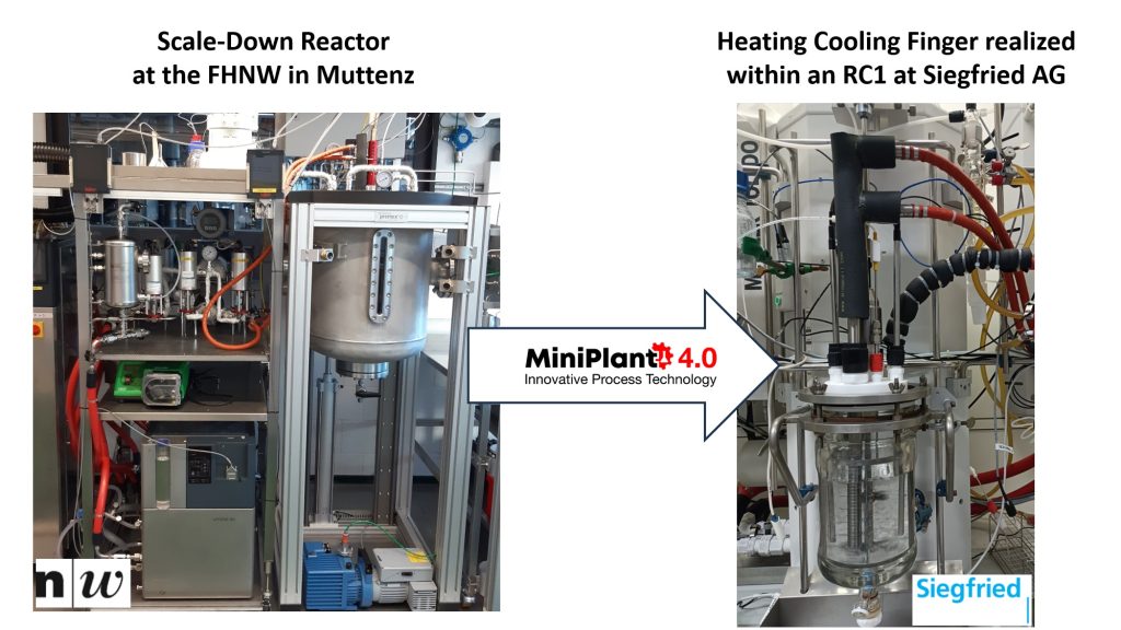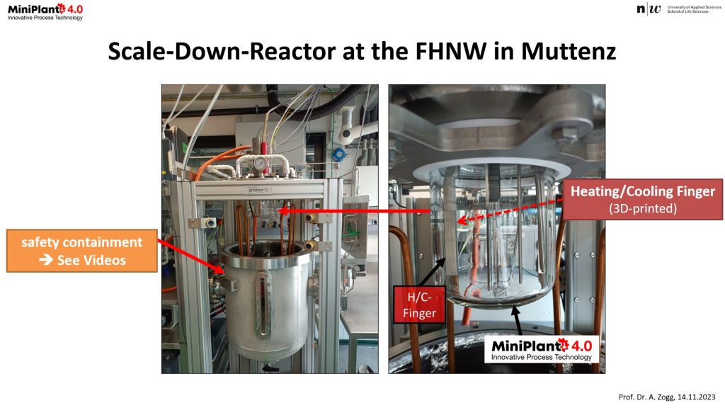 The association Miniplant 4.0, collaborating with Prof. Dr. A. Zogg’s team, has introduced an novel Scale-Down-Reactor. Located within the FHWN-HLS process technology center, this reactor features a heat exchanger known as heating/cooling-finger (H/C-Finger), replicating heat transfer characteristics of full-scale production plants. This 3D-printed H/C-Finger, available in materials like stainless steel, Hastelloy, and glass, enables early-stage investigations on the effects of wall temperature and materials used in the processes. The Scale-Down-Reactor thus shortens the development time and minimizes the needs for intermediate process trials in pilot scale equipment. Furthermore, the Scale-Down-Reactor enhances laboratory safety through a pressure-proof enclosure, ensuring containment in case of glass reactor breakage and thereby minimizing potential risks to lab personnel.