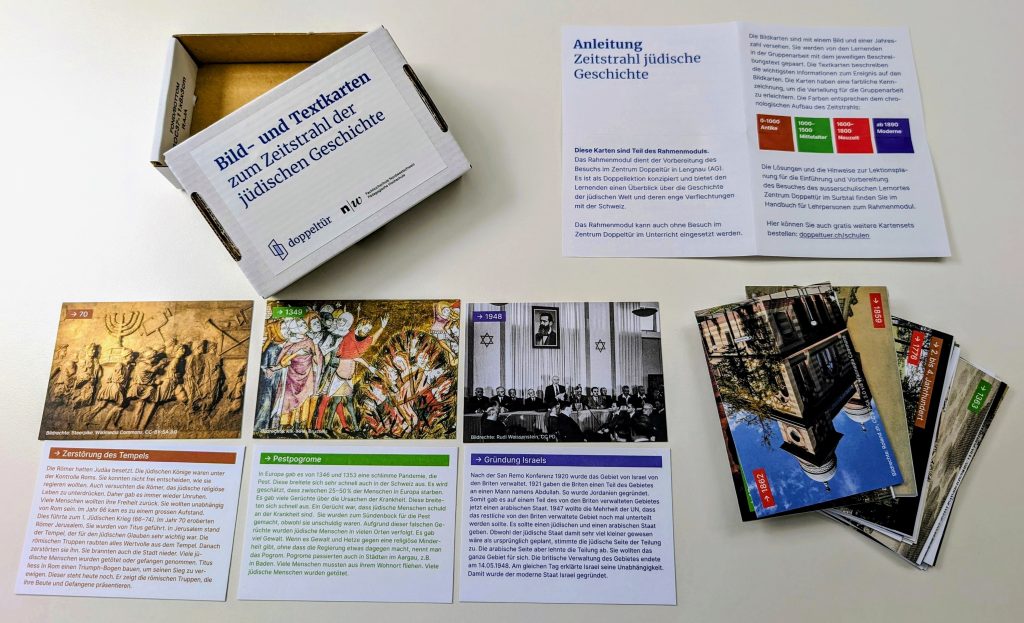 Die ersten Lehrmittel für den Einsatz in der Oberstufe (Sek 1) sind erarbeitet. Derzeit stehen das Rahmenmodul und das Badenmodul zur Verfügung, die auf der Website von Doppeltür kostenlos heruntergeladen werden können. Ein weiteres Modul wird bis Mitte 2025 fertiggestellt werden und besteht aus drei Rundgängen durch Lengnau und Endingen. Ein letztes Modul wird schliesslich die Ausstellung im Doppeltür Zentrum zum Thema haben.