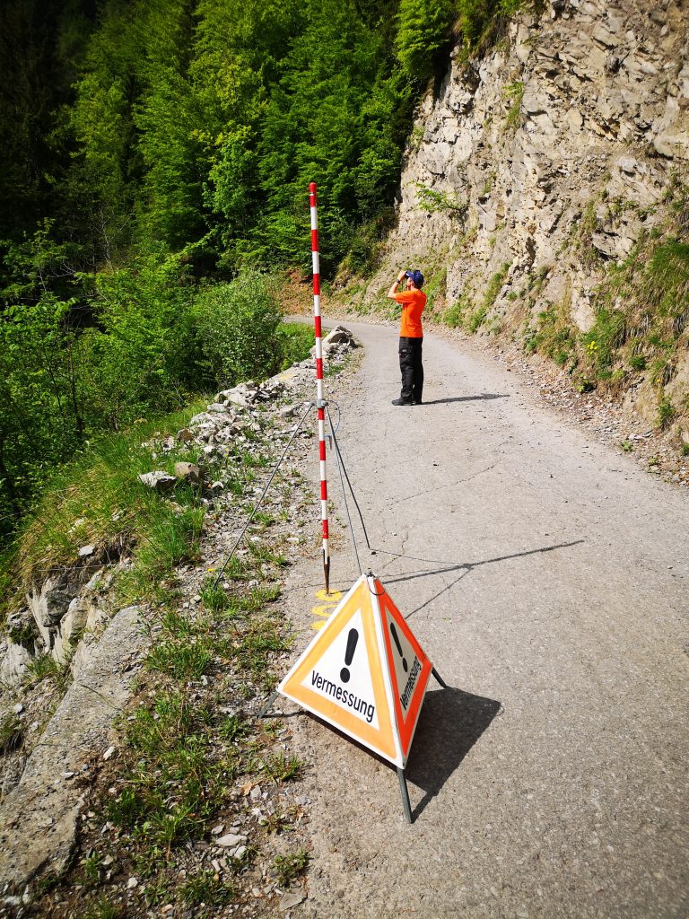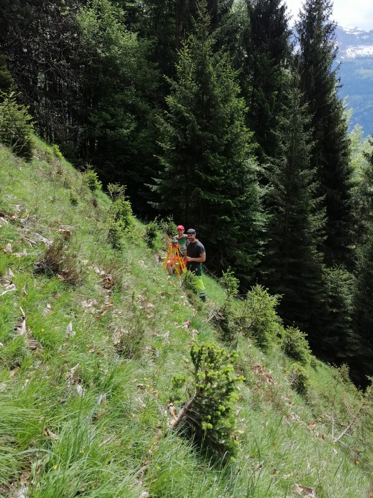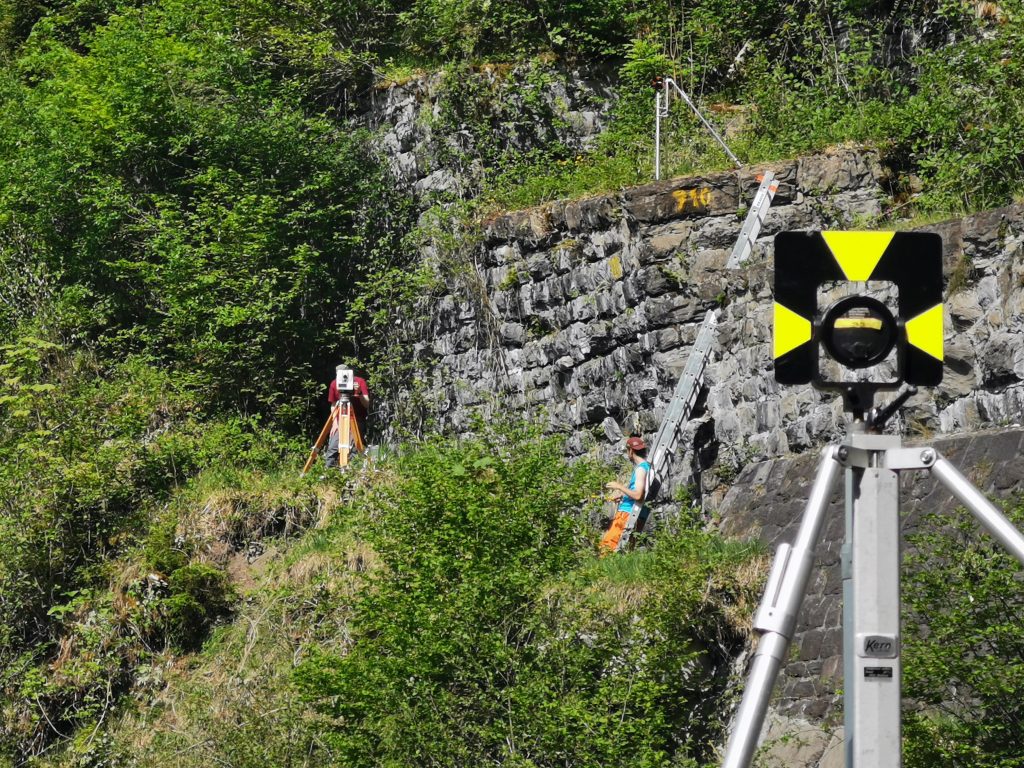 Die Messarbeiten teilten sich in folgende Schritte auf: Rekognoszierung, GNSS-Messungen, Freiholzen der Visuren, Messen des Deformationsnetzes und Scannen der Schwergewichtsmauer Sperre. Nach den ersten beiden Schritten musste festgestellt werden, dass die Natur in vier Jahren doch wieder ziemlich gewachsen ist. Das Freiholzen der Visuren wäre ohne die Unterstützung des Forstwarts nicht möglich gewesen. An dieser Stelle ein herzlicher Dank an Andreas Buchmann (Ändel)! Die meisten geplanten Visuren konnten dank ihm so gemessen werden.
