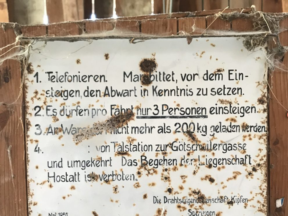 Die Talstation Spiringen-Kipfen bietet ein kleines Archiv verschiedener Benutzungsordnungen, die in den letzten 70 Jahren galten: Neuere Informationen werden jeweils einfach neben die alten gehängt oder an noch prominenterer Stelle platziert. So bleiben aber vergangene Betriebskonzepte sichtbar.
