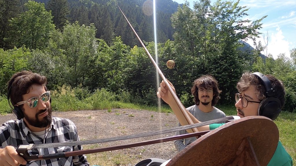 Wichtig ist zu wissen, dass nur ein kleiner Anteil tatsächlich mit blossem Ohr hörbar ist, sondern von den Spielenden über die Kontaktmikrophone und Kopfhörer kontrolliert wird. In diesem Fall war die akustische Situation zusätzlich extrem, da an einem schönen Samstagnachmittag hunderte von Motorräder die gleich daneben liegende Passstrasse rauf und runter donnern. Aufgrund der kontinuierlichen Aktivierung des Seils durch die Studierenden ist davon aber auf der Aufnahme praktisch nichts zu hören.