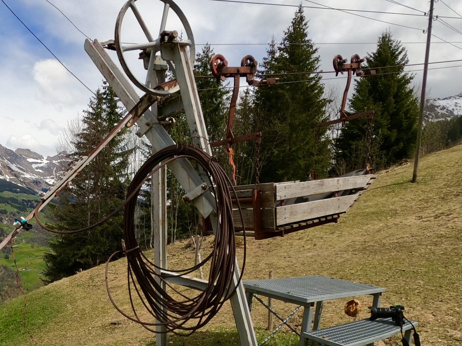 Eine interessante Beobachtung: Die Eigenschwingung von Seilen (bei weitgehender Windstille) scheint morgens aktiver zu sein als nachmittags. Möglicherweise wirkt die Erwärmung durch die aufgehende Sonne intensivierender als die nachmittägliche Abkühlung. Trotzdem hat sich auch diesmal eine längere Aufnahme des Sicherheitsseils der Materialseilbahn Unterschächen Stutz-Obsaum gelohnt.