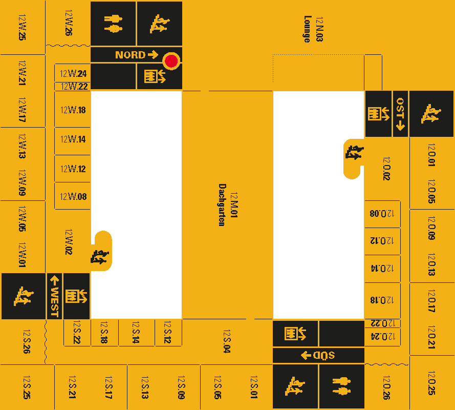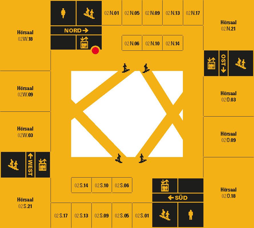 Für einfachen Zugang zu den Räumen, benutzen sie bitte die entsprechenden Aufzüge (z.B. für Raum 12.W.01 den Aufzug auf an der Westseite des Gebäudes, für 02.N.21 den Aufzug an der Nordseite, usw.).