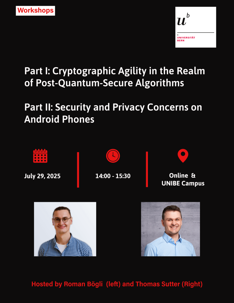 The University of Bern, in collaboration with the University of Applied Sciences and Arts Northwestern Switzerland (FHNW) and the Competence Centre Digital Trust, invites you to attend the workshop “Cryptographic Agility in the Realm of Post-Quantum-Secure Algorithms + Security and Privacy Concerns on Android Phones.”