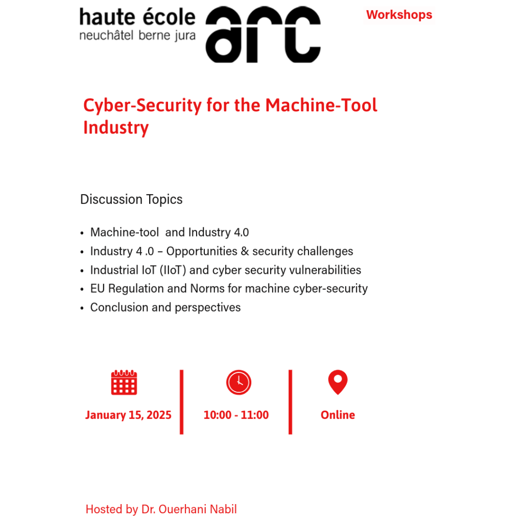 Haute Ecole Arc Neuchâtel in collaboration with the University of Applied Sciences and Arts Northwestern Switzerland (FHNW) and the Competence Center Digital Trust, invites you to attend the workshop “Cyber-Security for the Machine-Tool Industry.”