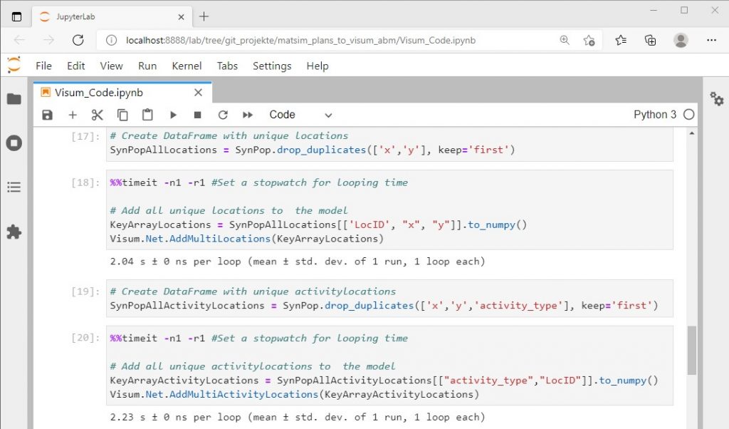 Für die Entwicklung des Codes ist die Wahl auf JupyterLab gefallen, da über die Schnittstelle Win32COM die Codevervollständigung (code completion) für von PTV Visum zur Verfügung gestellten Klassen und Funktionen eingerichtet werden konnte und bereits Vorkenntnisse vorhanden waren (vgl. Bild 2). Jupyter-Notebook ist eine web-basierte Bedienoberfläche, um Code zu entwickeln und auszuführen.