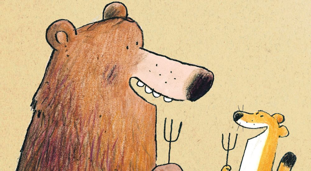 Bär findet im Wald drei grosse Pilze. Super, das gibt ein Festessen mit seinem Freund, dem Wiesel. Wiesel ist geübt im Kochen und bereitet diese drei Pilze auf eine überaus leckere Art und Weise zu. Beide setzten sich zu Tisch und bekommen sich auch gleich in die Haare: Drei Pilze für zwei Personen, wie soll das denn bitteschön gehen? Bär hat die Pilze schliesslich gefunden, also stehen ihm sicher zwei zu. Wiesel hat die Pilze gekocht, also steht doch ihm zweifellos die grössere Portion zu. Aber Bär ist grösser und Wiesel? Das muss noch wachsen. Die beiden geraten sich dermassen in die Haare, dass sie erst zu spät bemerken, wie sich ein listiger Fuchs anschleicht und sich den grössten Pilz schnappt. Jetzt kehrt plötzlich Ruhe ein, das Problem ist gelöst – hätte da nicht Wiesel noch drei Erdbeeren zum Nachtisch mitgebracht.