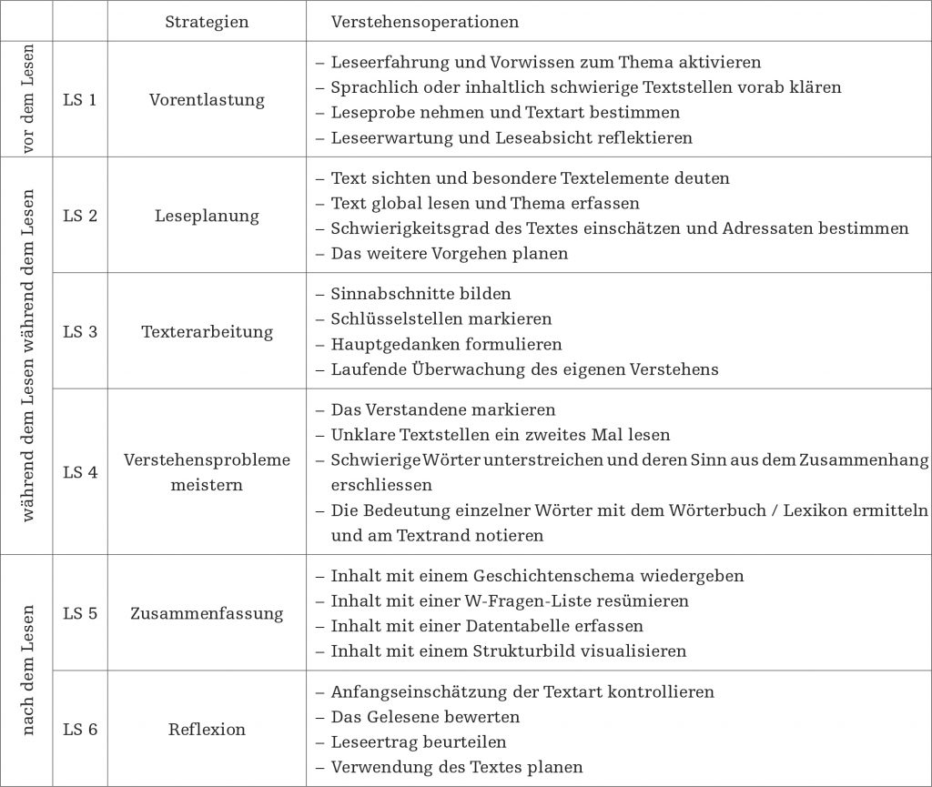 Das Lesestrategie-Training ist so strukturiert, dass sich eine sinnvolle Schrittfolge von Lesestrategien gemäss der zeitlichen Abfolge ihres Gebrauchs im Leseprozess ergibt (vor dem Lesen: LS1; während dem Lesen: LS2–4; nach dem Lesen: LS5–6). Eine Lesestrategie wird jeweils mit vier Handlungen (Verstehensoperationen) eingeübt und soll dann im situierten (thematischen) Lesen in allen Fächern immer wieder erinnert und angewendet werden: