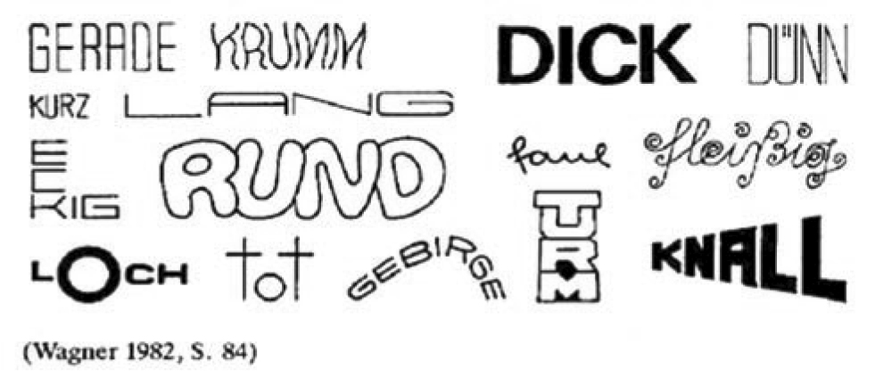 Vor allem für kleinere Schülerinnen und Schüler in den ersten Schuljahren können Spiele mit der Wortgestalt einen Einstieg in das Thema «konkrete Poesie» bieten, beispielsweise mithilfe von Antonymen. Die Lehrperson kann hierzu Beispiele vorbereiten und mit den Schülerinnen und Schülern die Besonderheit der Schrift bzw. der einzelnen Buchstaben (Form und Anordnung) im Gespräch herausarbeiten. Anschliessend entwerfen und bearbeiten die Schülerinnen und Schüler – in Partner- oder Gruppenarbeit – eigene Wortpaare entsprechend.
