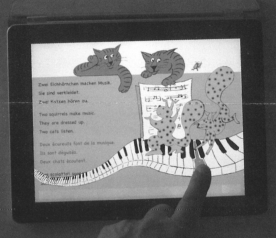 Das Antippen des mehrsprachigen Textes macht aus den Leserlnnen auch Regisseurlnnen und Komponistlnnen. Durch die intuitive Multitouch-Steuerung können Töne und Sprache gleichzeitig aktiviert werden, Texte – verbale und nonverbale – können in variabler Geschwindigkeit, ausschnittweise und auch rückwärts gespielt und dadurch in Tonfall und Rhythmus verändert werden. Die jeweils drei einfachen Sätze für die 14 Seiten der Ge schichte stehen gleichzeitig neben Deutsch, Französisch und Italienisch auch auf Englisch, Katalanisch, Finnisch, Spanisch, Slowenisch und Holländisch zur Verfügung. Sie sind so geschrieben, dass sie bereits für Schul- oder Fremdsprachanfänger verständlich sind. Hier bieten sich sprachvergleichende Gespräche an. Damit werden im Spiel mit dieser App nicht nur orale und literale Kompetenzen, sondern auch Language Awareness und Intercultural Awareness angesprochen.