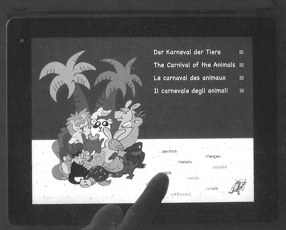 Gute Apps bieten vielfältige Möglichkeiten, die Teilkompetenzen Sprechen, Erfinden, Hören, Lesen, Verstehen und Schreiben zu fördern. «Karneval der Tiere» tut dies nicht in der mehr oder weniger versteckt–pädagogisierenden Art. Diese App wurde – basierend auf der bekannten musikalisch-zoologischen Suite von Camille Saint–Saens (1835-1921) – als zu bespielendes Audio Bilderbuch und nicht als Lernsoftware entwickelt.