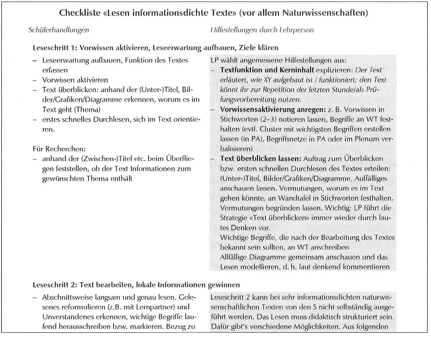 Abb: Anriss der Checkliste «Lesen informationsdichter Texte» aus der Handreichung «Sprachbewusst unterrichten – Eine Unterrichtshilfe für den Fachunterricht»